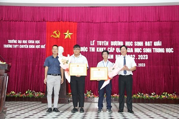Giáo viên hướng dẫn cùng hai học sinh Trường THPT Chuyên Khoa học Huế (trực thuộc Trường ĐH Khoa học, ĐH Huế) đoạt giải cao trong kỳ thi Khoa học kỹ thuật cấp quốc gia dành cho học sinh trung học năm học 2022-2023 vừa được trao tặng bằng khen của Chủ tịch UBND tỉnh và giấy khen của Hiệu trưởng Trường ĐH Khoa học trong lễ tuyên dương chiều 17/4.