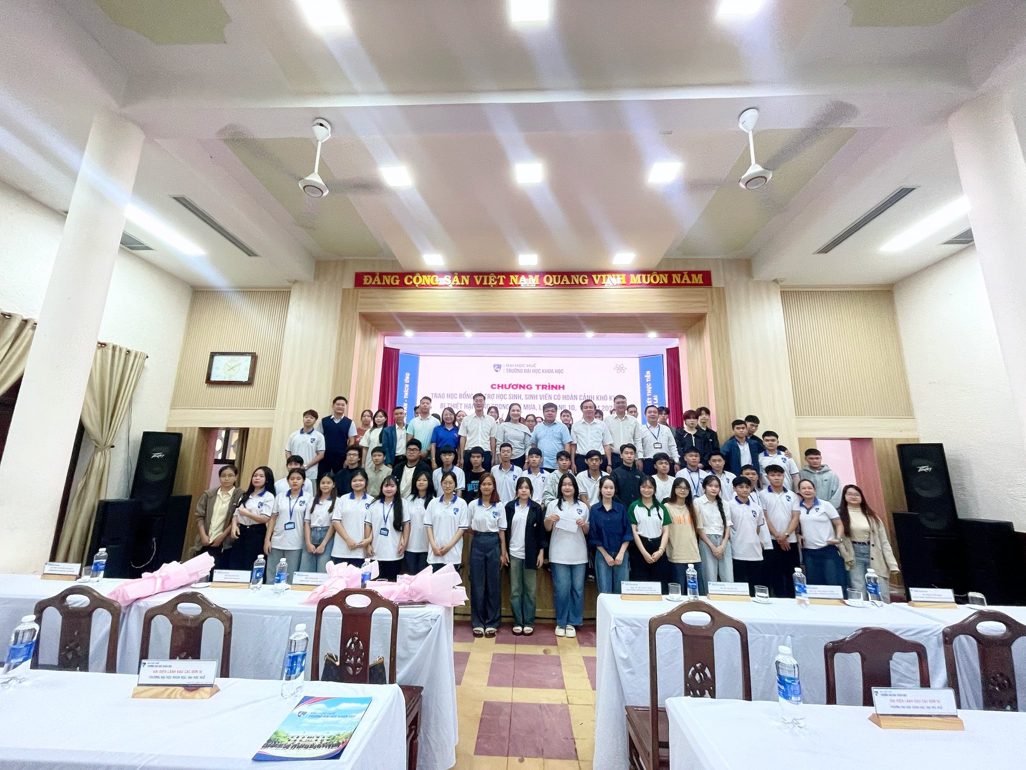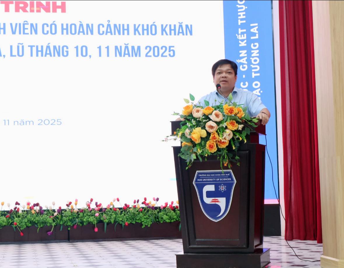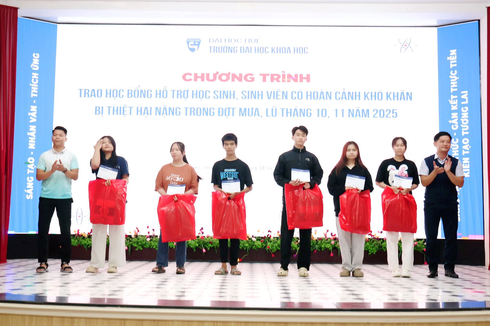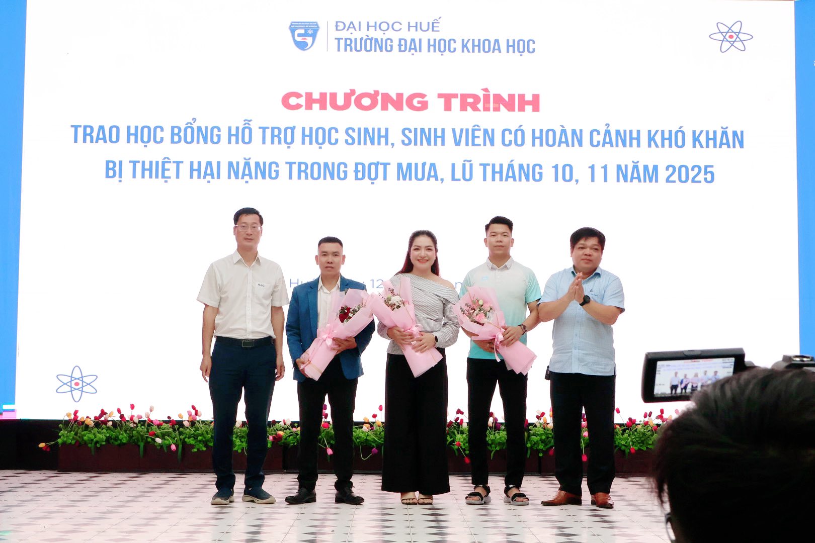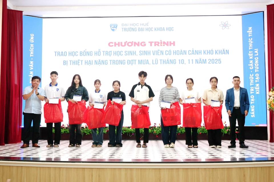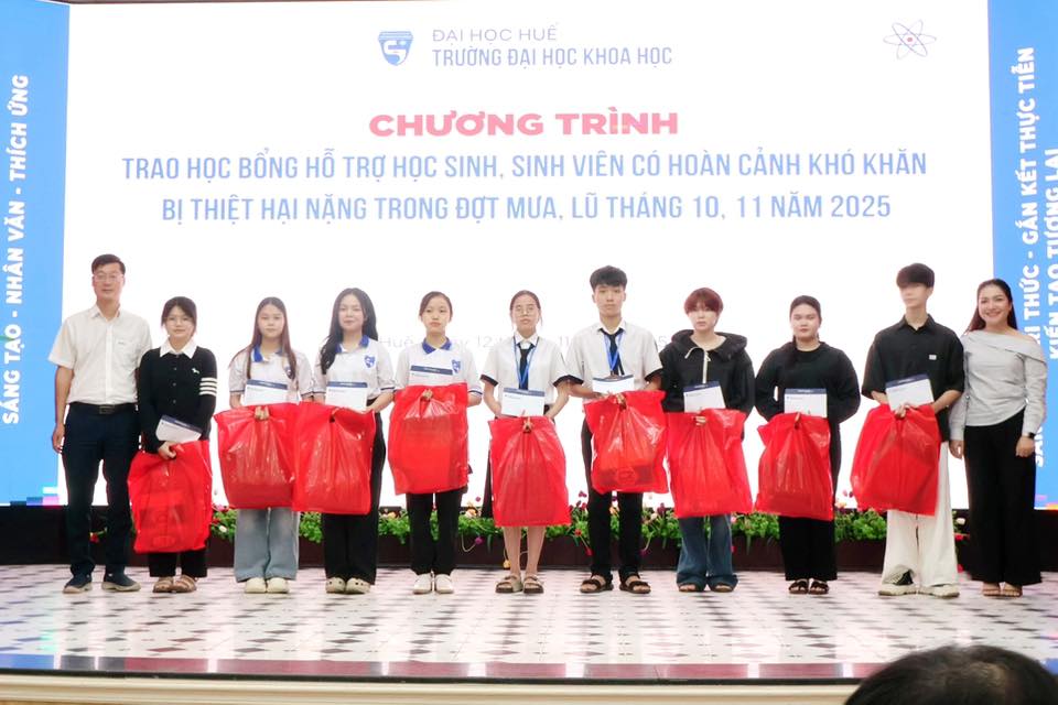 Sáng ngày 12/11/2025, Trường Đại học Khoa học, Đại học Huế đã tổ chức Lễ trao học bổng hỗ trợ học sinh, sinh viên có hoàn cảnh khó khăn bị ảnh hưởng bởi đợt mưa lũ tháng 10 và 11 năm 2025, đồng thời tuyên dương các sinh viên tiêu biểu có thành tích xuất sắc trong công tác phòng, chống và khắc phục hậu quả thiên tai.