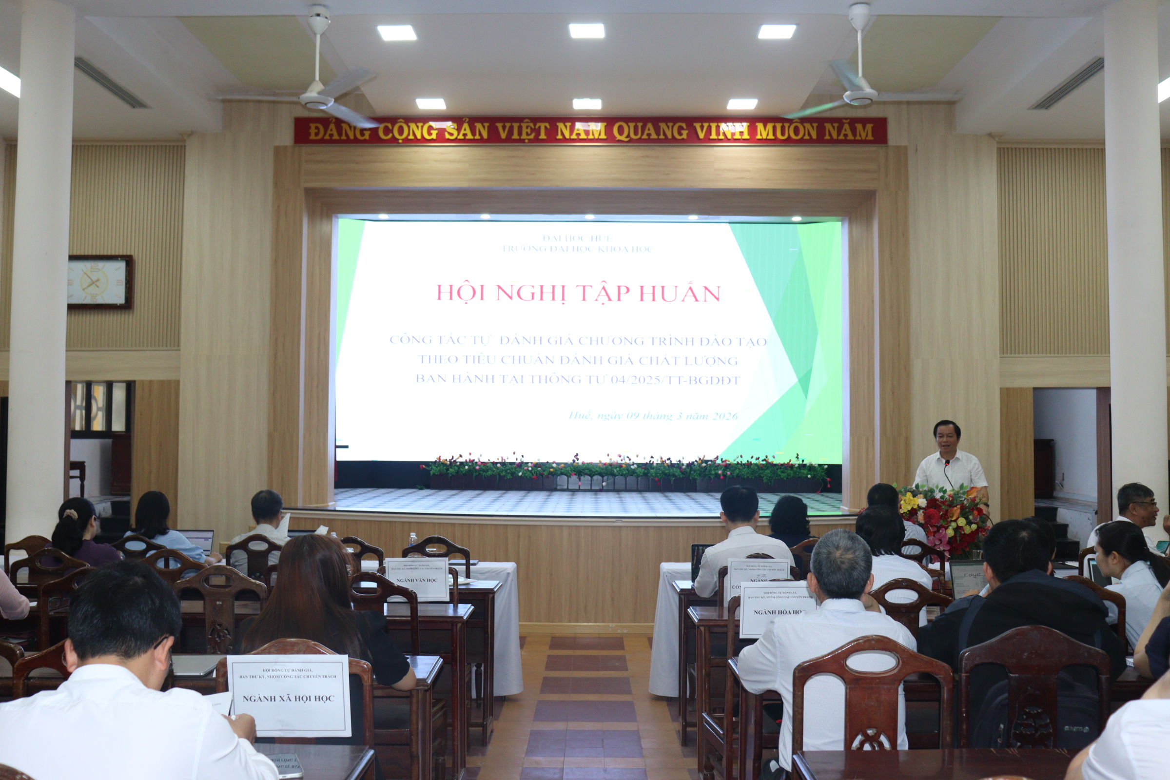 Sáng ngày 09/3/2026, tại Hội trường A1, Trường Đại học Khoa học, Đại học Huế đã tổ chức Hội nghị tập huấn công tác tự đánh giá chương trình đào tạo theo Tiêu chuẩn đánh giá chất lượng ban hành tại Thông tư 04/2025/TT-BGDĐT của Bộ Giáo dục và Đào tạo Việt Nam. Hội nghị nhằm giúp các đơn vị trong Nhà trường nắm vững các yêu cầu mới về đảm bảo và kiểm định chất lượng chương trình đào tạo trong giai đoạn hiện nay.