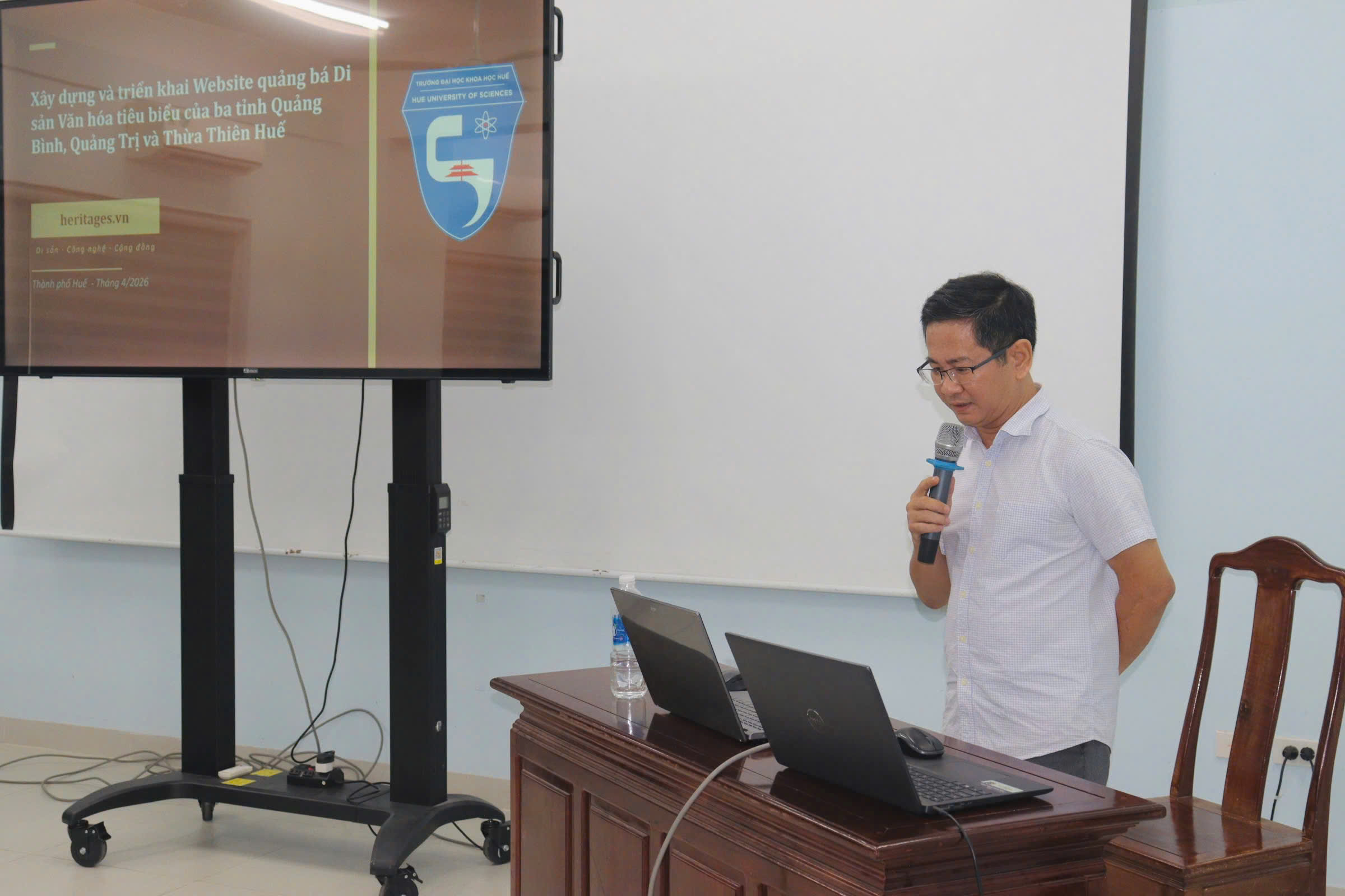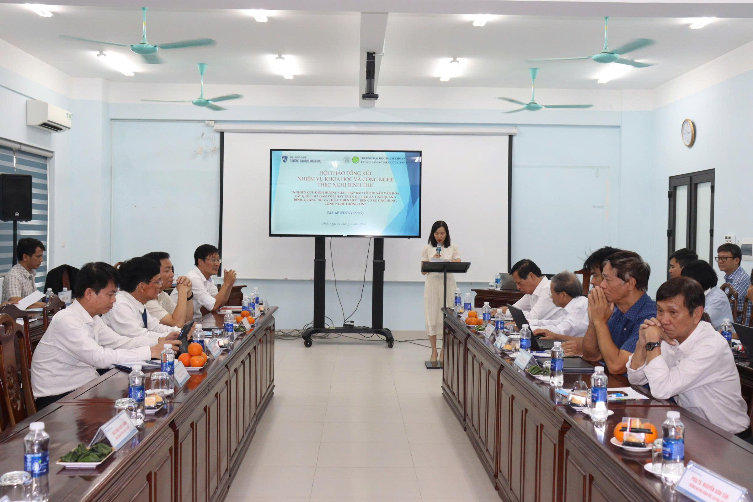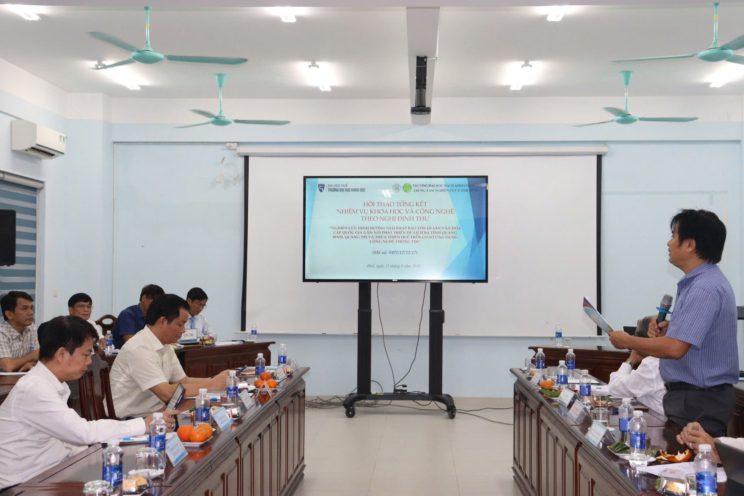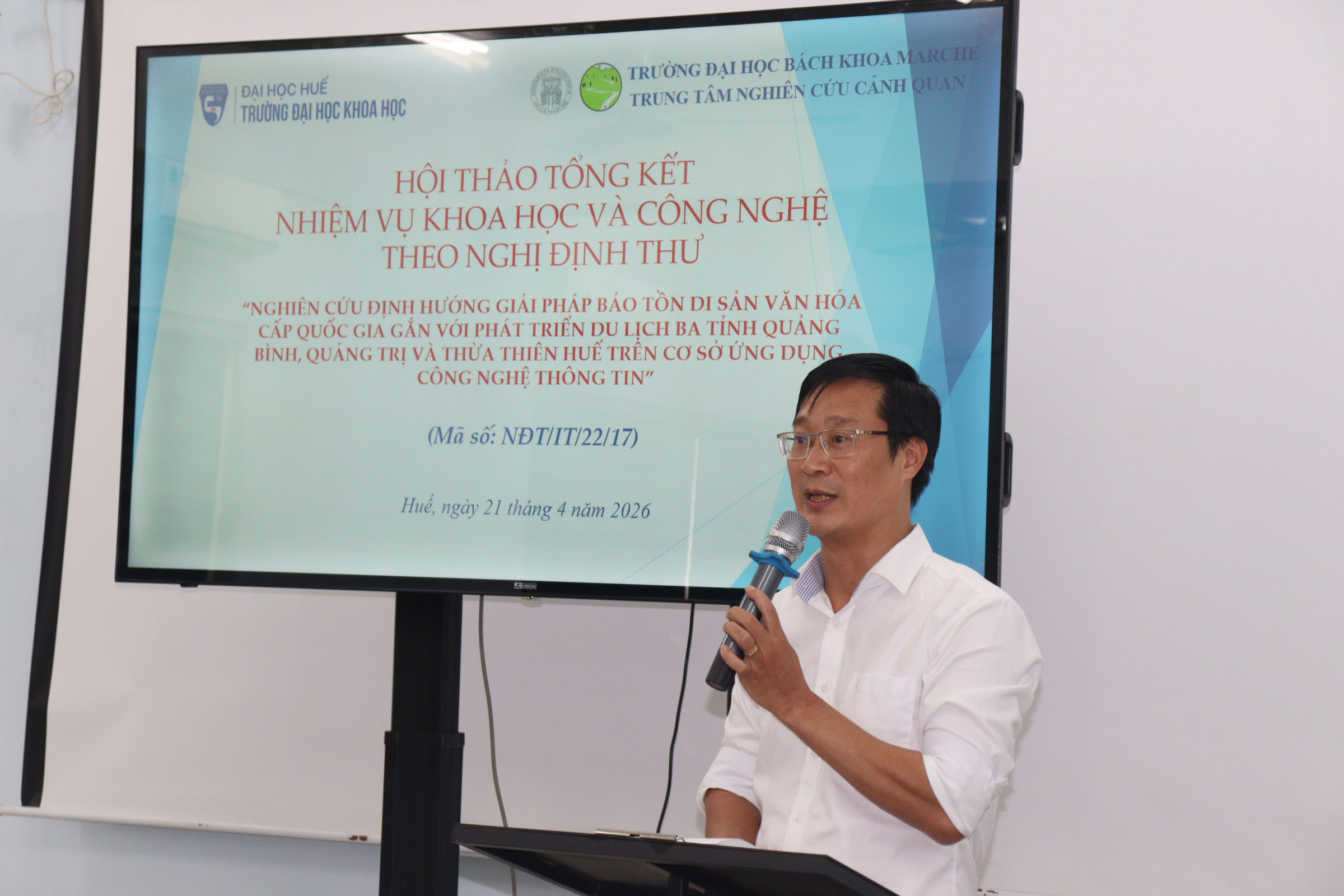 Từ 14 giờ 30 phút ngày 21/4/2026, Trường Đại học Khoa học, Đại học Huế tổ chức Hội thảo Tổng kết Nhiệm vụ Khoa học và Công nghệ theo Nghị định thư “Nghiên cứu định hướng giải pháp bảo tồn di sản văn hóa cấp quốc gia gắn với phát triển du lịch ba tỉnh Quảng Bình, Quảng Trị và Thừa Thiên Huế trên cơ sở ứng dụng công nghệ thông tin” (The research of orientated solutions to preserve national cultural heritage associated with tourism development in Quang Binh, Quang Tri and Thua Thien Hue Provinces on the basic of information technology application) tại Khu vực nhà D - 77 Nguyễn Huệ, thành phố Huế, Trường. Hội thảo nằm trong khuôn khổ Nhiệm vụ Khoa học và Công nghệ theo Nghị định thư, Mã số NĐT/IT/22/17 hợp tác giữa Việt Nam và Italy do PGS.TS. Hoàng Văn Hiển làm Chủ nhiệm và Trường Đại học Khoa học là cơ quan chủ trì.